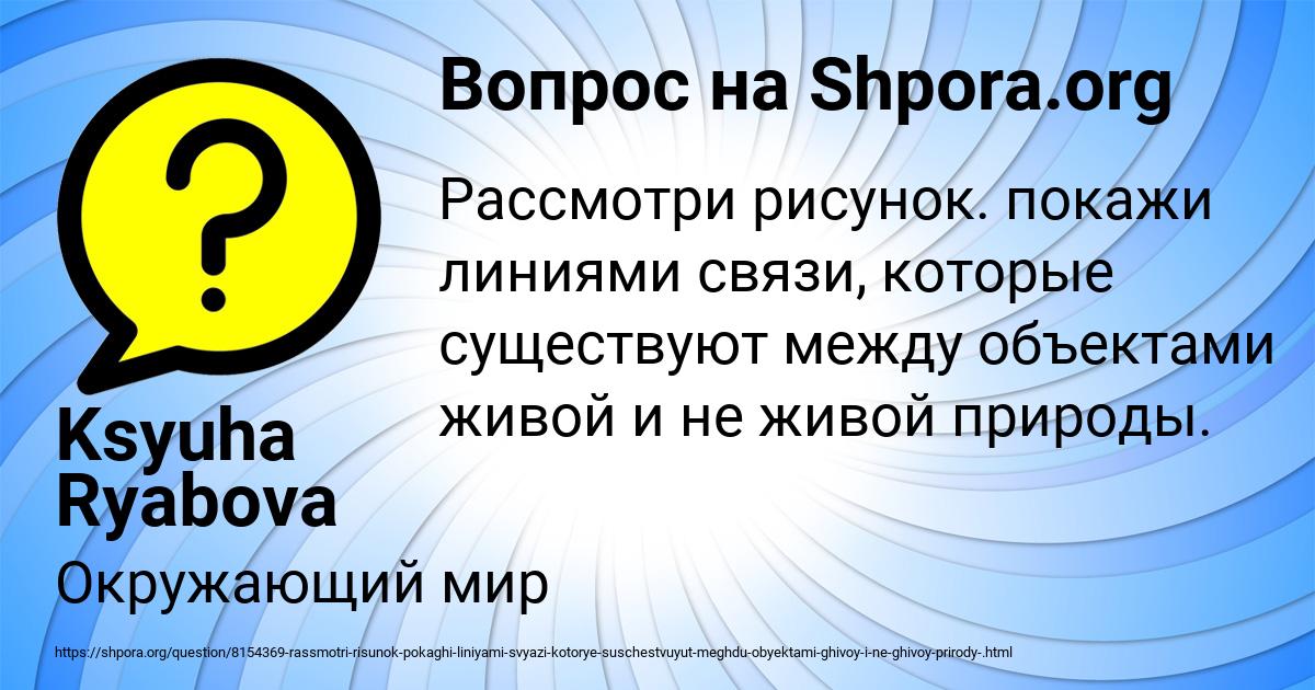 ⭐⭐⭐⭐⭐ Лучший ответ на вопрос «Рассмотри рисунок. покажи линиями связи, которые существуют между объектами живой и не живой природы. » от пользователя Ksyuha Ryabova в разделе Окружающий мир. Задавайте вопросы и делитесь своими знаниями.