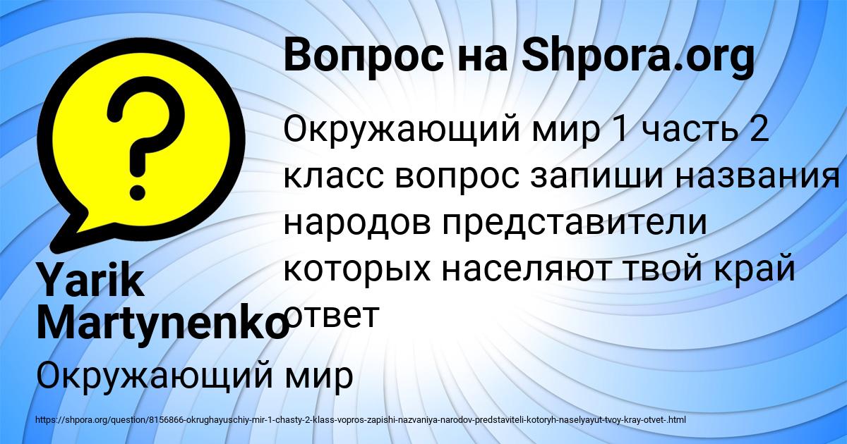⭐⭐⭐⭐⭐ Лучший ответ на вопрос «Окружающий мир 1 часть 2 класс вопрос запиши названия народов представители которых населяют твой край ответ » от пользователя Yarik Martynenko в разделе Окружающий мир. Задавайте вопросы и делитесь своими знаниями.