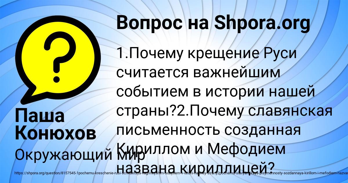 ⭐⭐⭐⭐⭐ Лучший ответ на вопрос «1.Почему крещение Руси считается важнейшим событием в истории нашей страны?2.Почему славянская письменность созданная Кириллом и Мефодием названа кириллицей? » от пользователя Паша Конюхов в разделе Окружающий мир. Задавайте вопросы и делитесь своими знаниями.