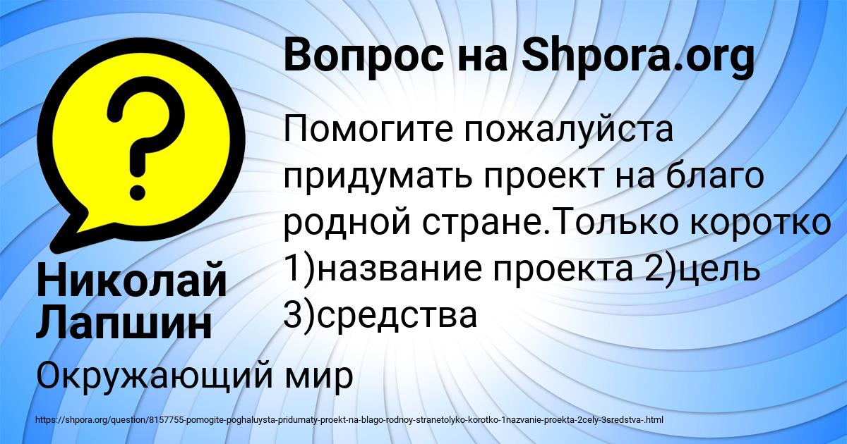 ⭐⭐⭐⭐⭐ Лучший ответ на вопрос «Помогите пожалуйста придумать проект на благо родной стране.Только коротко 1)название проекта 2)цель 3)средства » от пользователя Николай Лапшин в разделе Окружающий мир. Задавайте вопросы и делитесь своими знаниями.