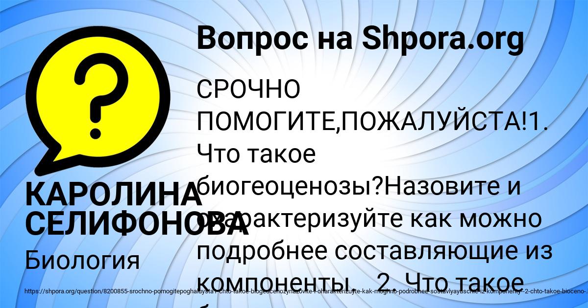 ⭐⭐⭐⭐⭐ Лучший ответ на вопрос «СРОЧНО ПОМОГИТЕ,ПОЖАЛУЙСТА!1. Что такое биогеоценозы?Назовите и охарактеризуйте как можно подробнее составляющие из компоненты. 2. Что такое биоцено » от пользователя КАРОЛИНА СЕЛИФОНОВА в разделе Биология. Задавайте вопросы и делитесь своими знаниями.