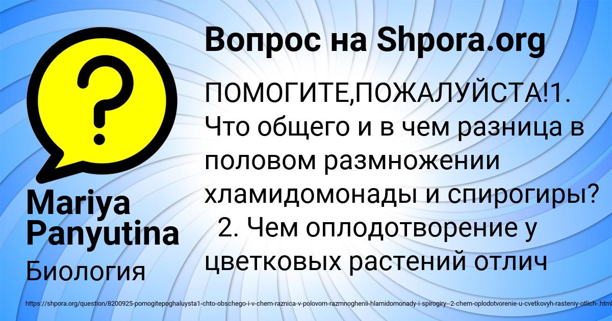 ⭐⭐⭐⭐⭐ Лучший ответ на вопрос «ПОМОГИТЕ,ПОЖАЛУЙСТА!1. Что общего и в чем разница в половом размножении хламидомонады и спирогиры? 2. Чем оплодотворение у цветковых растений отлич » от пользователя Mariya Panyutina в разделе Биология. Задавайте вопросы и делитесь своими знаниями.