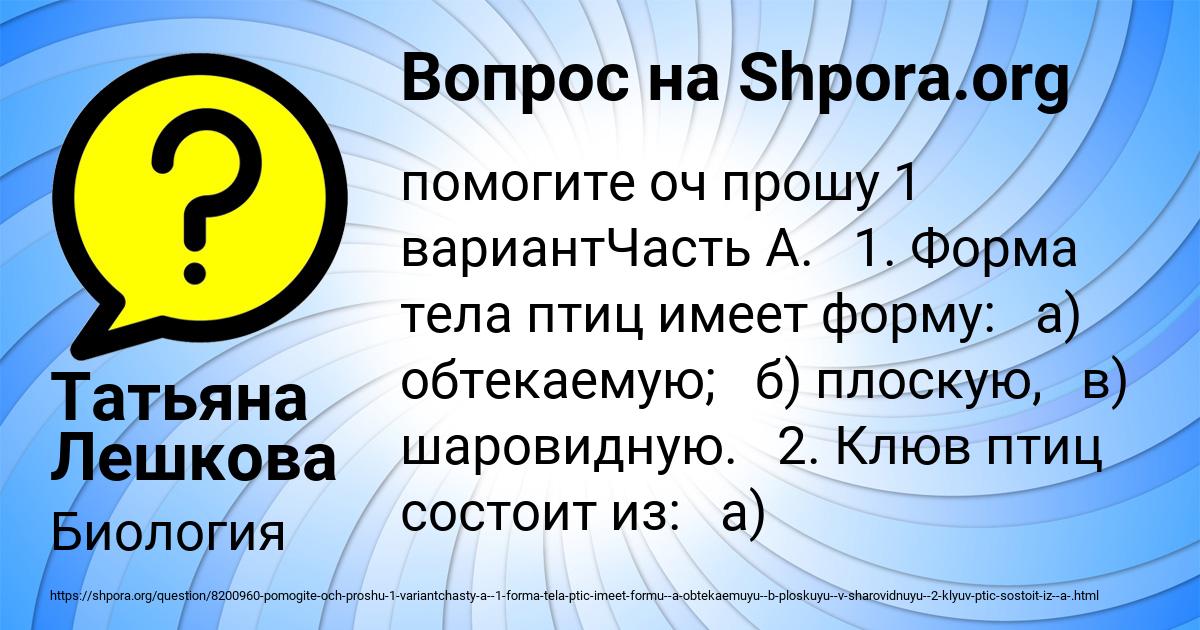 ⭐⭐⭐⭐⭐ Лучший ответ на вопрос «Помогите оч прошу 1 вариантЧасть А. 1. Форма тела птиц имеет форму: а) обтекаемую; б) плоскую, в) шаровидную. 2. Клюв птиц состоит из: а) » от пользователя Татьяна Лешкова в разделе Биология. Задавайте вопросы и делитесь своими знаниями.
