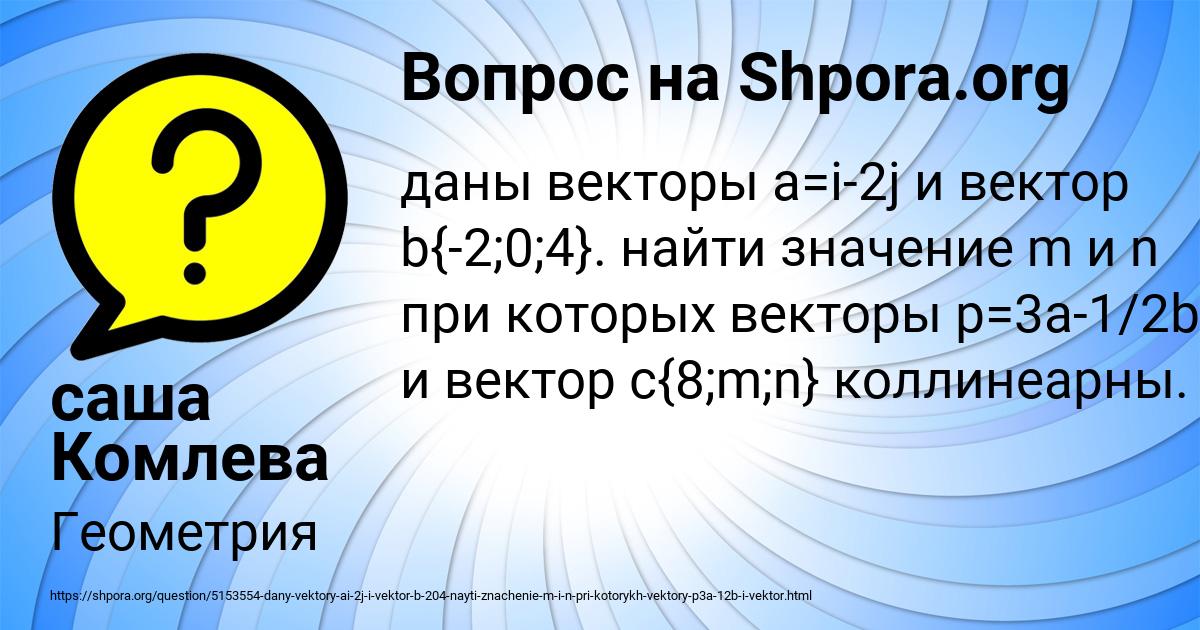 ⭐⭐⭐⭐⭐ Лучший ответ на вопрос «Даны векторы a=i-2j и вектор b{-2;0;4}. найти значение m и n при которых векторы p=3a-1/2b и вектор c{8;m;n} коллинеарны.» от пользователя саша Комлева в разделе Геометрия. Задавайте вопросы и делитесь своими знаниями.