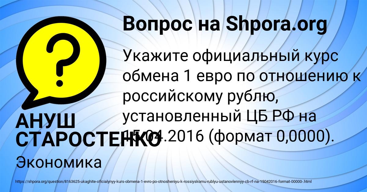 ⭐⭐⭐⭐⭐ Лучший ответ на вопрос «Укажите официальный курс обмена 1 евро по отношению к российскому рублю, установленный ЦБ РФ на 15.04.2016 (формат 0,0000). » от пользователя АНУШ СТАРОСТЕНКО в разделе Экономика. Задавайте вопросы и делитесь своими знаниями.