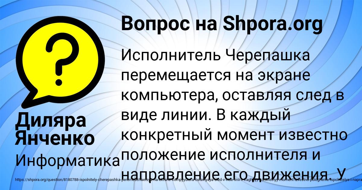 ⭐⭐⭐⭐⭐ Лучший ответ на вопрос «Исполнитель Черепашка перемещается на экране компьютера, оставляя след в виде линии. В каждый конкретный момент известно положение исполнителя и направление его движения. У ис » от пользователя Диляра Янченко в разделе Информатика. Задавайте вопросы и делитесь своими знаниями.