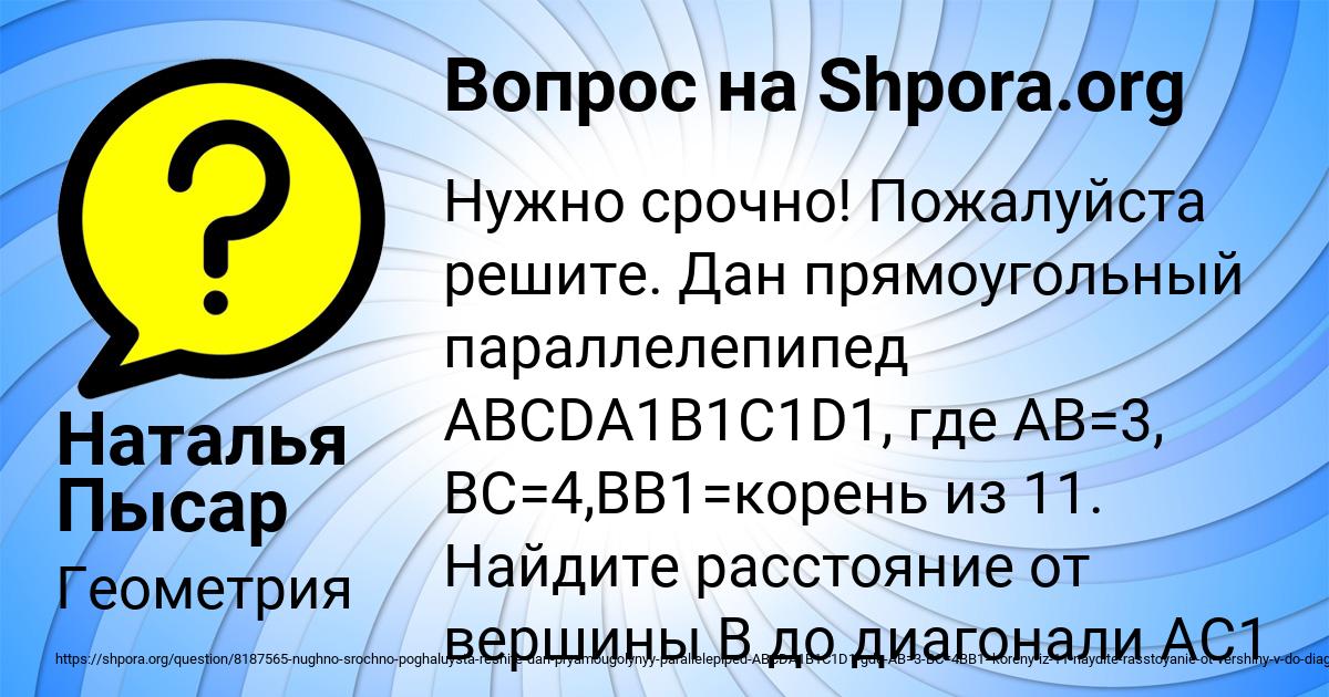 ⭐⭐⭐⭐⭐ Лучший ответ на вопрос «Нужно срочно! Пожалуйста решите. Дан прямоугольный параллелепипед ABCDA1B1C1D1, где AB=3, BC=4,BB1=корень из 11. Найдите расстояние от вершины В до диагонали AC1 » от пользователя Наталья Пысар в разделе Геометрия. Задавайте вопросы и делитесь своими знаниями.