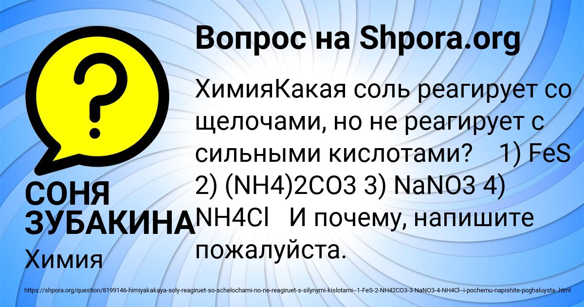 ⭐⭐⭐⭐⭐ Лучший ответ на вопрос «ХимияКакая соль реагирует со щелочами, но не реагирует с сильными кислотами? 1) FeS 2) (NH4)2CO3 3) NaNO3 4) NH4Cl И почему, напишите пожалуйста. » от пользователя СОНЯ ЗУБАКИНА в разделе Химия. Задавайте вопросы и делитесь своими знаниями.